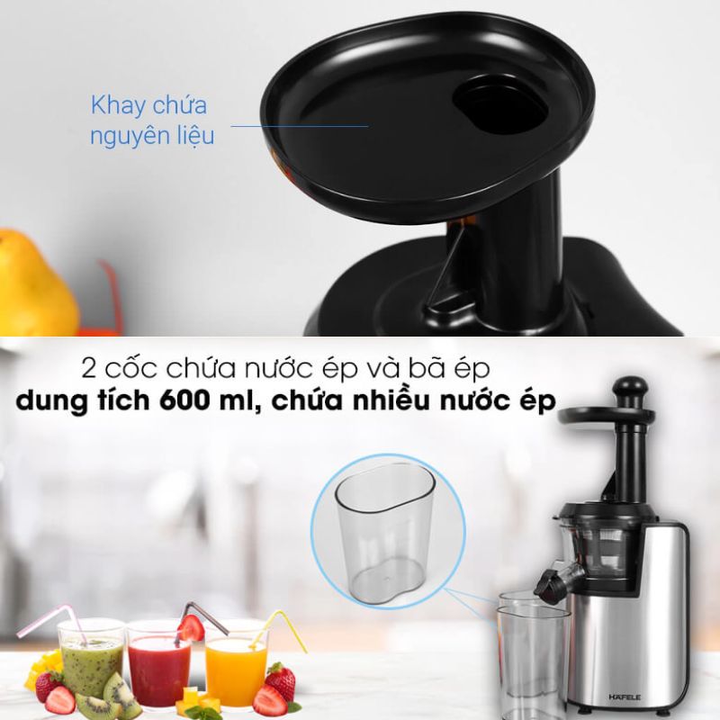 - Máy ép trái cây Hafele có công suất 200W cùng động cơ DC, hệ thống trục ép mạnh mẽ mang lại hiệu suất ép cao, thu được nhiều nước ép