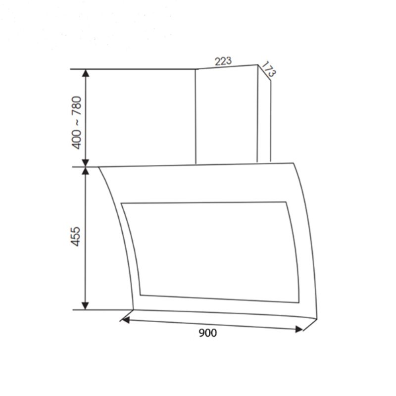 - Kiểu máy toa kính vát được gắn áp tường tiết kiệm diện tích, kích thước 900 mm tương thích với mọi kiểu bếp thông dụng nhất có từ 3 vùng nấu trở lên.